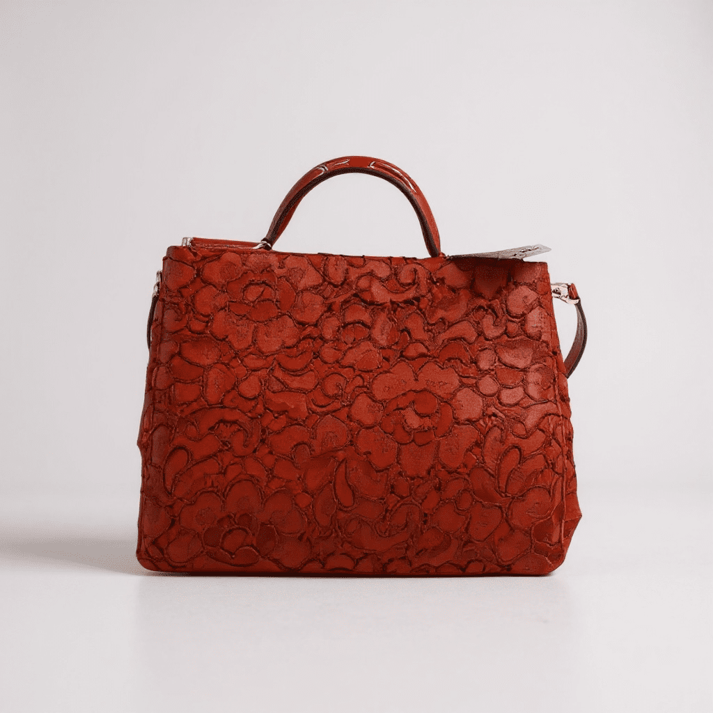 - Red patent leather accents